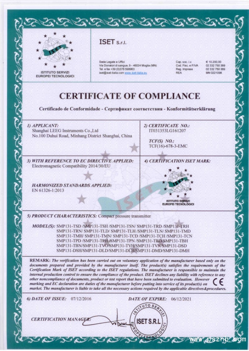 荣誉资质 立格仪表 DMP305X单晶硅压力变送器-CE证书