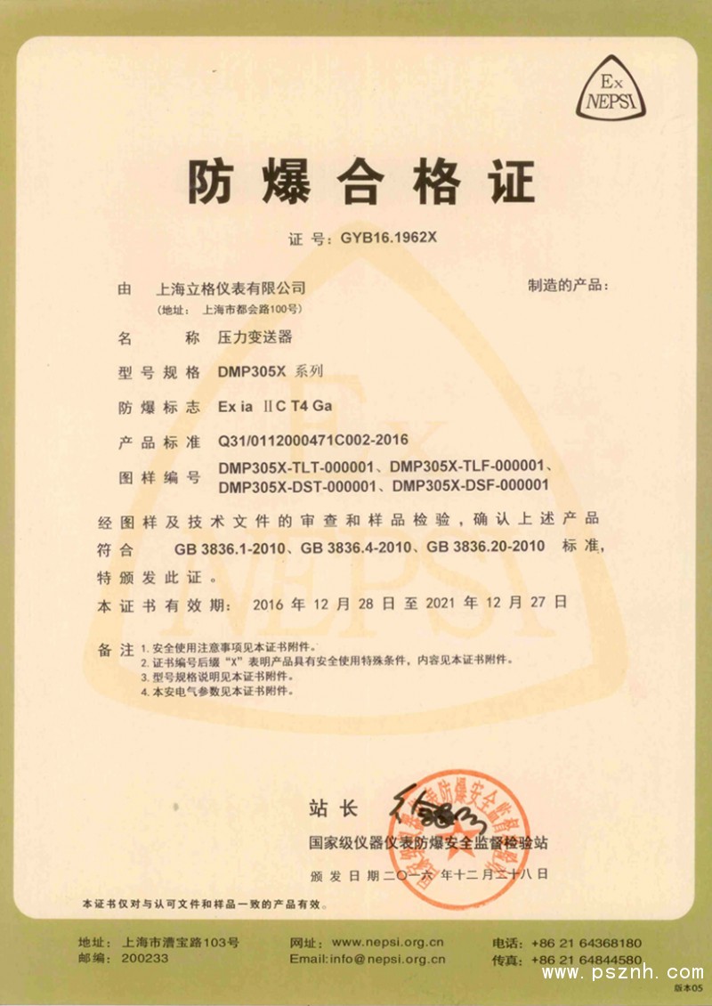 荣誉资质 立格仪表 DMP305X单晶硅压力变送器-本安防爆证书
