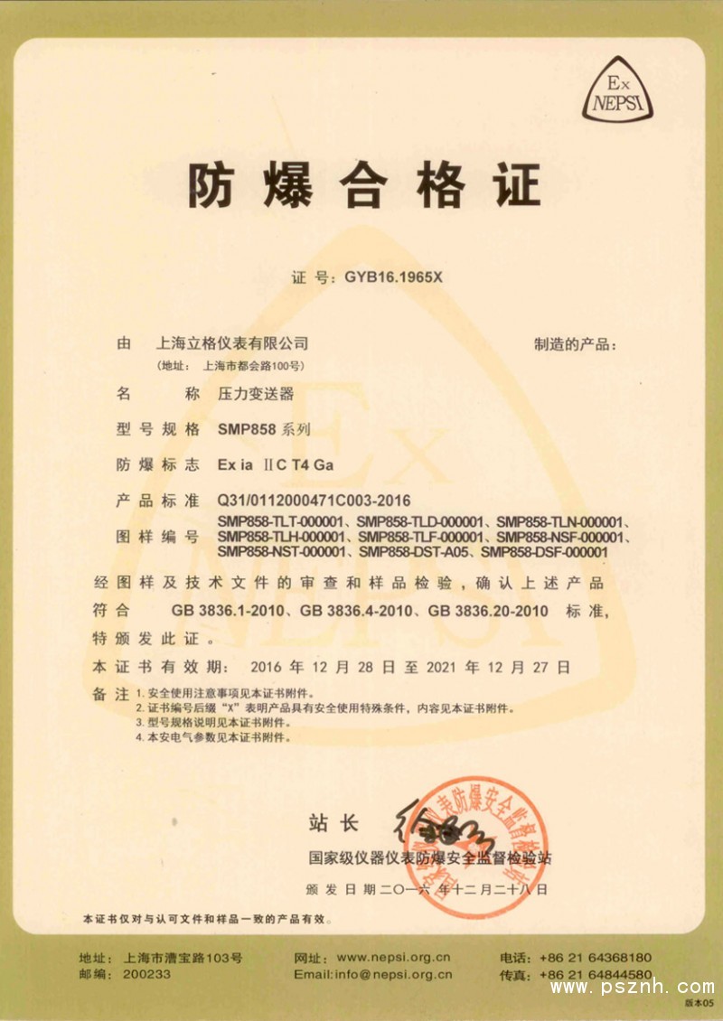 荣誉资质 立格仪表SMP858单晶硅压力变送器-本安防爆证书