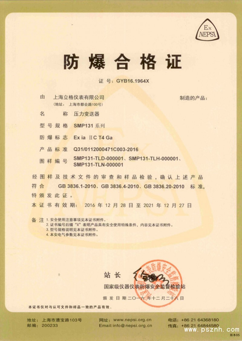 荣誉资质 立格仪表 SMP131单晶硅压力变送器-本安防爆证书